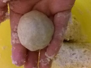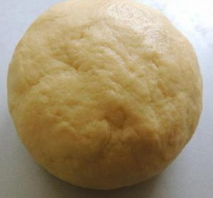 Na mistura seca resultante, amasse rapidamente a manteiga e água, temos uma massa macia.