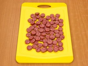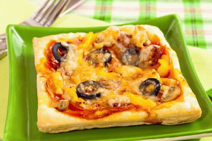 De acordo com esta receita, você pode cozinhar pizza deliciosa em casa com recheio variado.Em vez de salsichas, use salsicha, presunto, carne cozida.