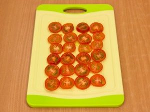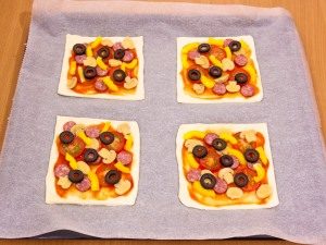 - Enrole a massa em uma camada com uma espessura de cerca de 2-3 mm, recorte quadrados com lados de 10×10 cm.